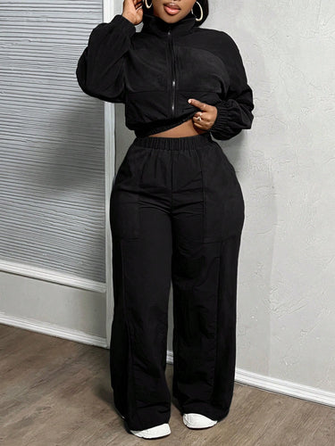 2 pièces : Veste de survêtement zippée à col montant casual et décontractée + pantalon droit à doublure thermique, pour femmes, automne/hiver