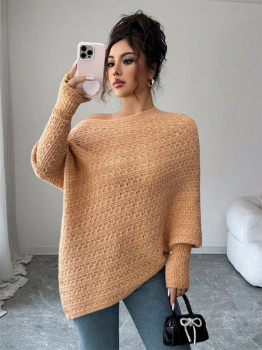 Pull tricoté élégant et Top de gamme pour femmes avec col oblique, ourlet asymétrique, manches oversize et poignets resserrés. Nouveauté pour l'automne/hiver