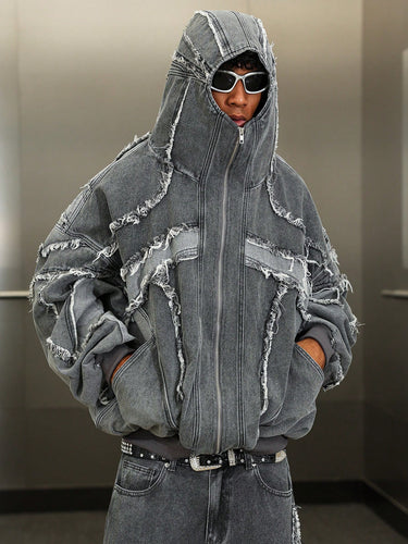 Veste en jean zippée décontractée pour homme, style patchwork effiloché, style de rue
