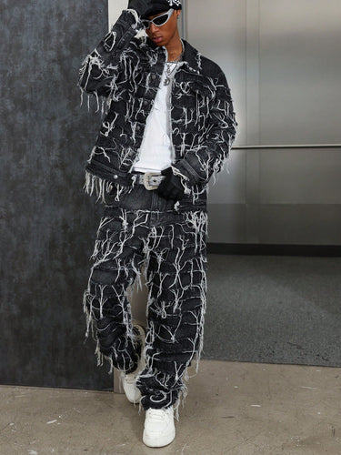 Ensemble en jean style américain avec patch et franges. Pantalon à franges pour hommes noir et blanc, vêtements d'automne