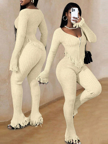 2 pièces Ensemble pull tricoté sexy taille haute avec fermeture éclair et gland pour femmes en automne/hiver