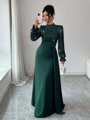 Robe longue évasée à manches longues avec ornements de sequins élégants, convient pour les banquets, les fêtes, les invités de mariage, le Nouvel An, Noël