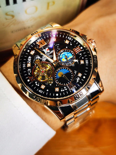 Montre mécanique automatique hommes affichage de phase de lune tourbillon creux ciel étoilé, marque de prestige, bracelet en acier inoxydable, boîtier doré rose, montre d'affaires et de loisirs, cadeau