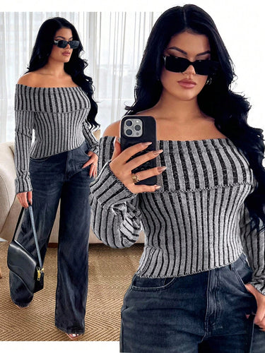 Pull asymétrique décontracté avec épaules dénudées pour femmes,Topt côteléToput avec épaules dénudéeTopaut à manches longues avec épaules dénudées pour l'automne et l'hiver