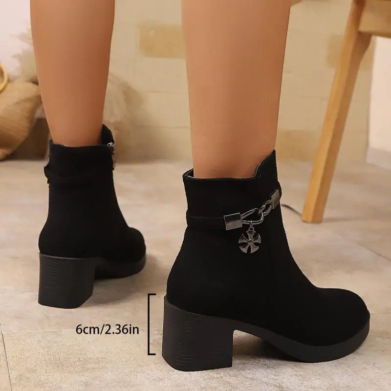 Bottines Chelsea confortables à talons épais et en daim noir pour femme, bottines courtes avec fermeture éclair latérale, décoration en métal, automne 2025, 42