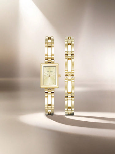 Montre-bracelet à quartz dorée pour femme avec cadran carré champagne clair et rayon de soleil. Montre analogique de luxe avec bracelet réglable. Montre élégante pour femme. Cadeau idéal.